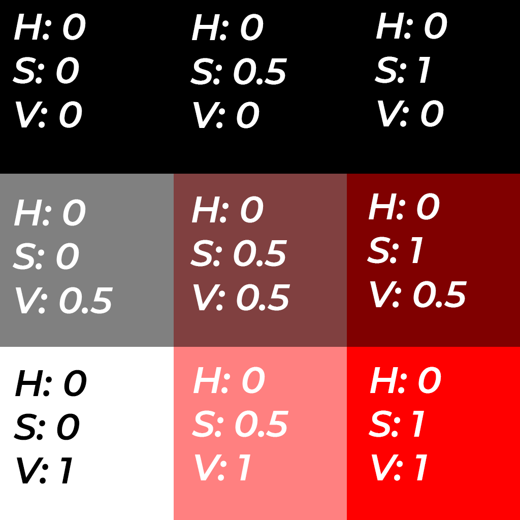 However, the CMYK color model doesn't escape the more fundamental problem that we don't usually look at colors and describe them in terms of how red, blue and green they are, or in terms of how cyan, magenta, yellow, and black they are. For that, we can turn to another model, the one we'll be using for most of the rest of this tutorial: the HSV color model. HSV stands for "Hue Saturation Value", and you'll sometimes also see it called "Hue Saturation Lightness" (HSL), or "Hue Saturation Brightness" (HSB).3 HSV is what's called a "cylindrical" color model, as opposed to the cubic geometry of the RGB color model. H represent's the color in question's position on the color wheel, forming the circular top of the HSV cylinder. You can think of hue as a number of degrees around the color wheel, with 0 degrees being red, 120 degrees being green, 240 degrees being blue, and 360 degrees being red again, with the rest of the color wheel filling in the gaps. Sometimes this is represented by a number of degrees, but more often you'll see it like the parameters in an RGB color, either a real number between 0 and 1 or an integer between 0 and 255. Saturation can be thought of as the distance of the color from the center of the cylinder, or as the color's "paleness". Saturation is essentially a parameter that goes from completely white at 0 to being completely the hue at maximum value. Colors with saturations around 0 are often called "pastel colors". Value is similar, except it goes from completely black at 0 to completely the color (as modified by the saturation value) at maximum. This is kind of confusing to explain, but if you exammine the examples below it will probably make more sense.