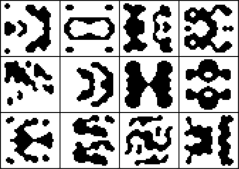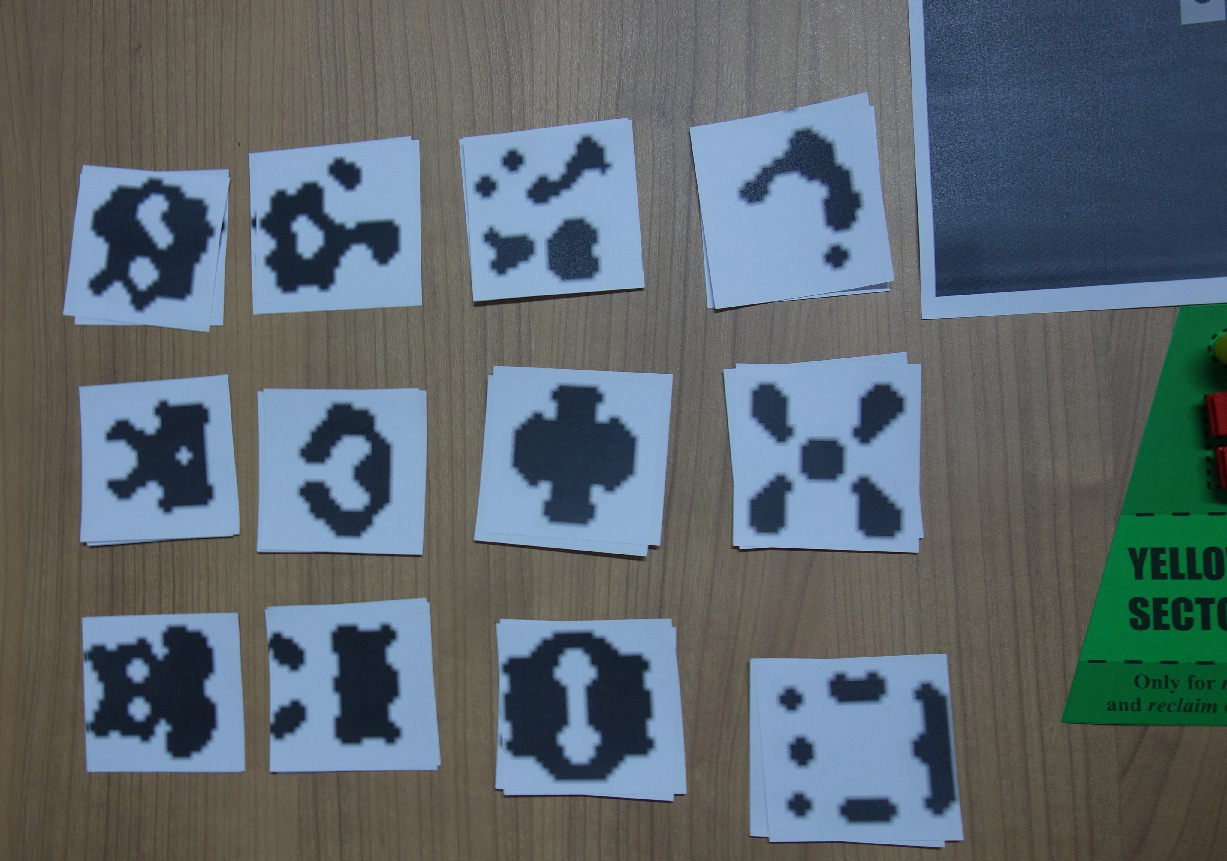 The role of procedural content generation in this game is not to randomize the initial state or to handle game-state progression (both are handled in a traditional way by shuffling the alien threat deck). Finding patterns in the randomly generated symbols (ambiguous black splotches on white paper, much like Rorschach tests) and constructing a common language out of them is the core challenge and the core mechanic of the game. Deciphering or combining ambiguous images or semantics has been used in boardgames such as Dixit, Codenames or Cards Against Humanity, and forming a co-operative shared lexicon of abstract visuals is vital in Mysterium and Codenames: Pictures.