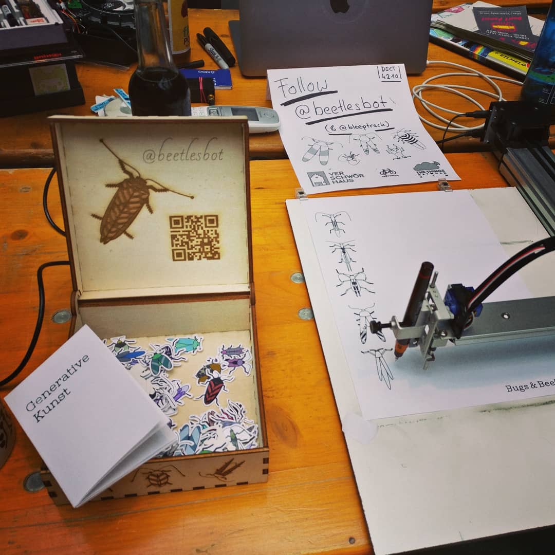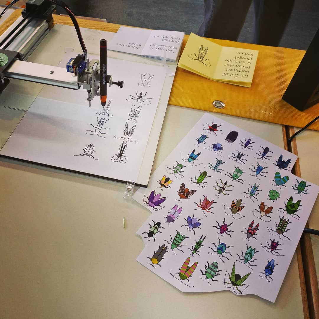 Now that the beetles can be generated, I started creating fun applications: first the twitter bot @beetlesbot that generates a new beetle every 6 hours and adds a nice generated name to the bug. To create this bot, I had to port the whole code to p5.js (javascript version of Processing). And to make a nicer image, I added the wing pattern in low opacity to the background. This improved the bot images a lot! I made pen plotter plots, and therefore had to rewrite the whole code again in paper.js and find a new way to generate the wing pattern. I printed stickers, t-shirts and fabric to make shawls from it and I have lots of other ideas what to do with my new little friends.