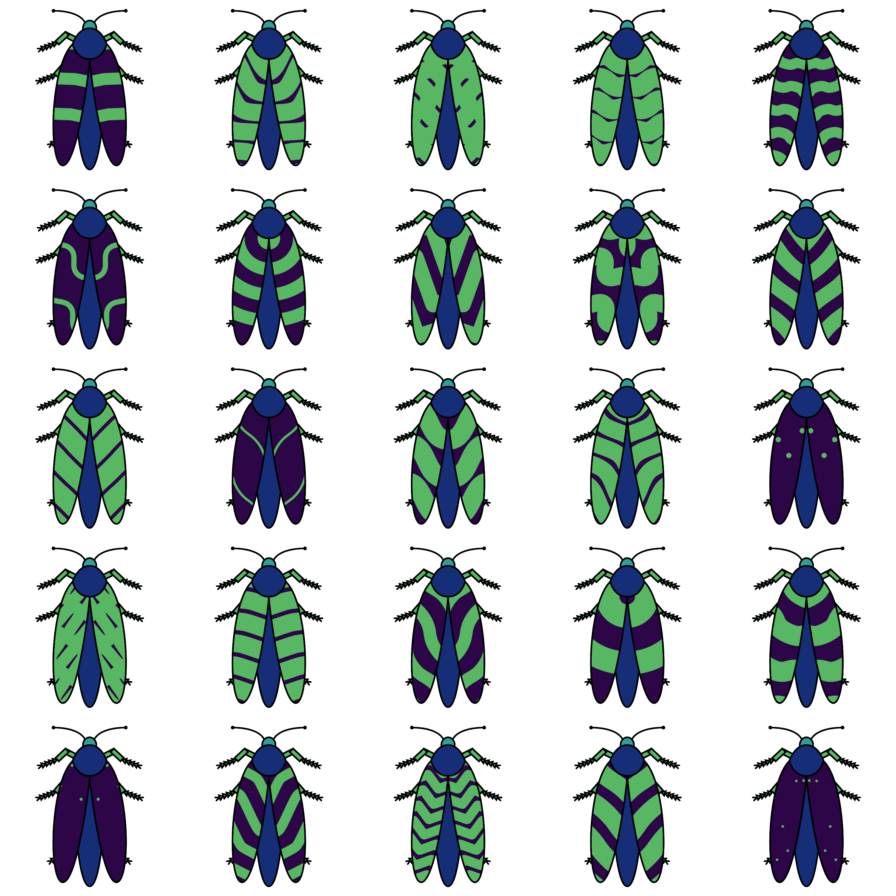 Because of the great response to my tweet, I decided to keep going and give the bugs a colored version. Actually, this was the harder part. First: wing pattern. Two pattern ware created very fast: one which consists of small, random placed little dots, the other one consists of concentric rings with the center at the wing center point. But, dots and rings were not exciting enough. So I decided to create a pattern made of wavy lines. Here I had lots of parameters to fiddle around with and a huge variety of wing pattern grew from this method. This is the part I am most proud of in retrospect.