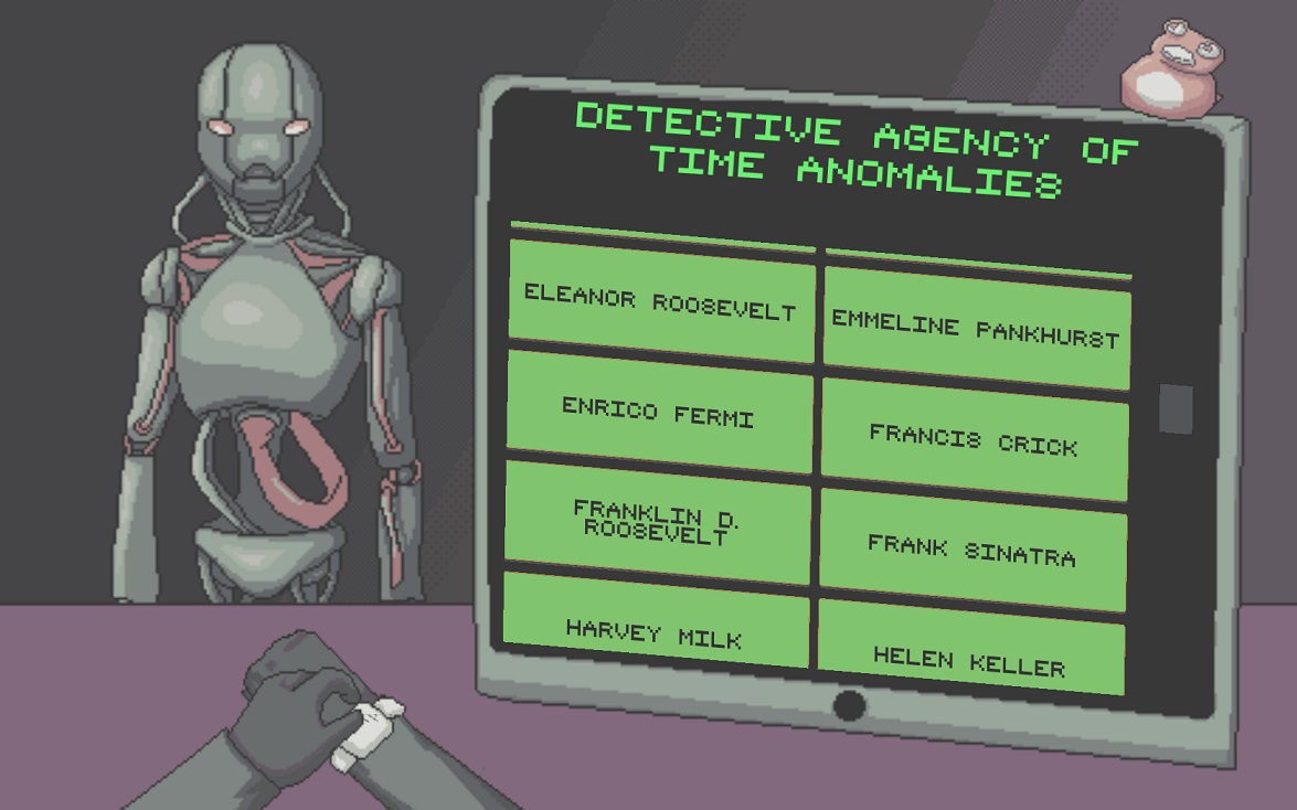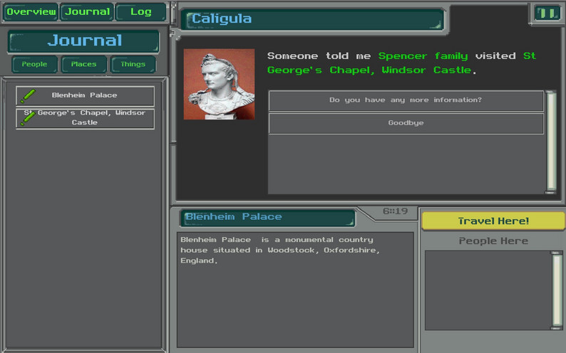 Gabriella Barros, Mike Green, Julian Togelius and I designed a game which takes advantage of information on open data repositories and transforms it into an adventure game. The game is called "DATA Agent" and the player is an agent of the Detective Agency of Time Anomalies (DATA) tasked with solving a bizarre mystery. An assassin has traveled back in time and killed a famous person, masquerading as another famous person somehow related to the victim. Since the assassin does not know everything about the person they impersonate, the DATA Agent must find in a lineup of suspects which one does not have all their facts right. The correct facts about the suspects can be found by talking to other people in different cities. Finding the suspects themselves is no easy task either: the agent must talk to other people, read books and break into dark and locked places.