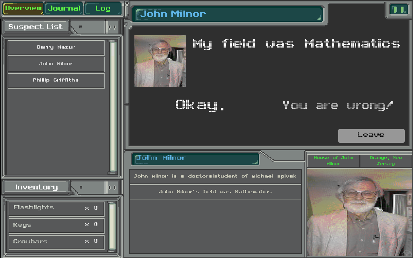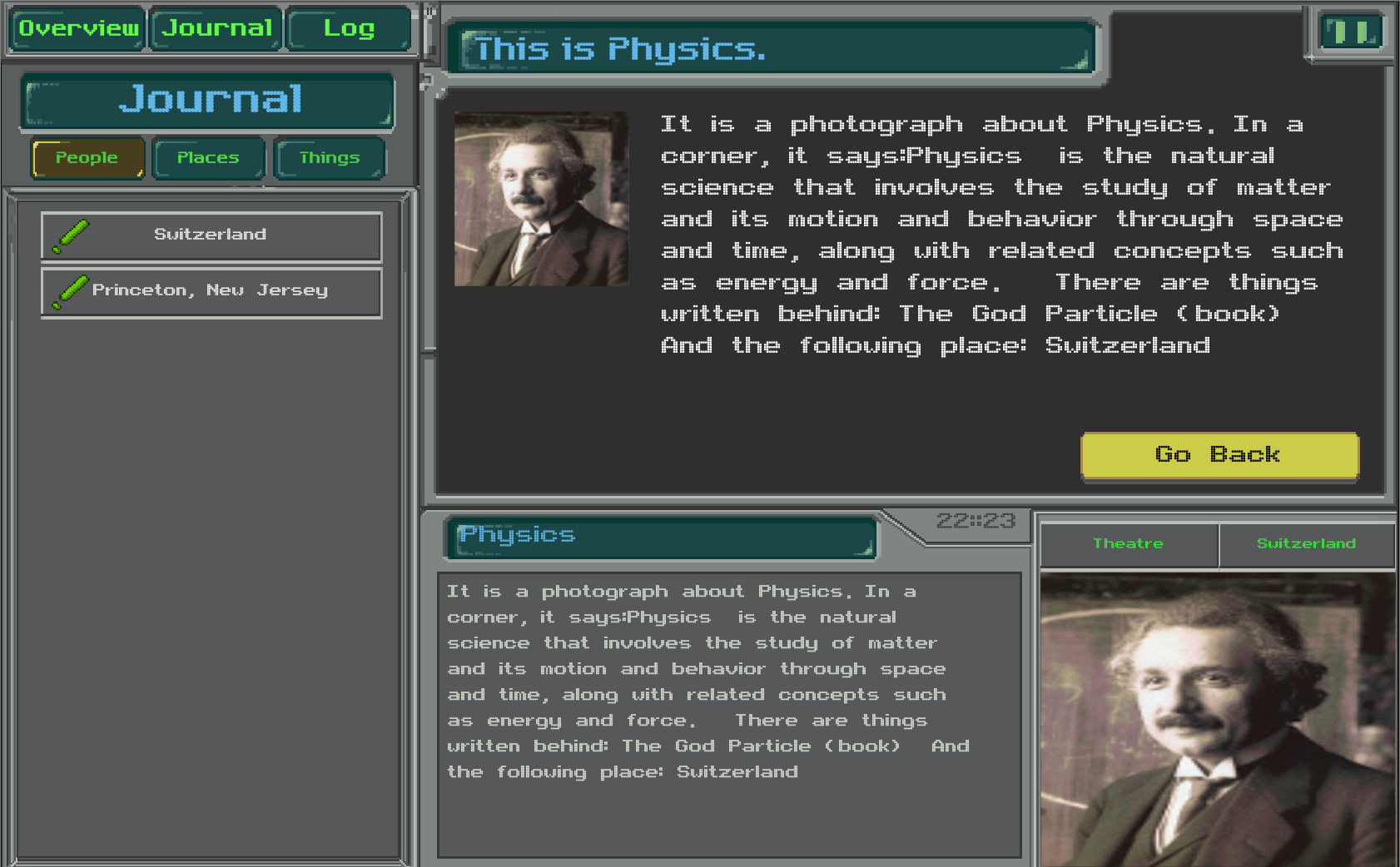 Most of the game mechanics in DATA Agent require the player to interact with real-world data, transformed into game elements such as locations, non-player characters, items, books and facts. The centerpiece is the murder victim, which is chosen by a designer before the game is generated. Around the victim, the generator starts by finding possible suspects among people with Wikipedia articles that share as many common attributes with the victim as possible (e.g. the same birth date or the same thesis advisor) but also have different attributes with other suspects. Once suspects are found, one of them is randomly chosen to be the culprit (the time-traveling doppelganger) and one of their facts is changed. Each suspect is linked back to the victim through a chain of entities in the Wikipedia knowledge ontology (essentially, finding the degrees of separation in Wikipedia: https://en.wikipedia.org/wiki/Wikipedia:Six_degrees_of_Wikipedia); those links are transformed into in-game characters or books, placed in locations around the world based on their origin (e.g. their birthplace) or places found in the chain. Dialog with characters is generated based on templates to point to the next clue (unlocking a new character, item and/or location) but can also provide some information about the character (such as their date of birth or subject). Finally, some puzzle elements are added by "locking" some locations and ensuring that "keys" can be found by the player (torches to unlock dark places, crowbars to unlock chained places).