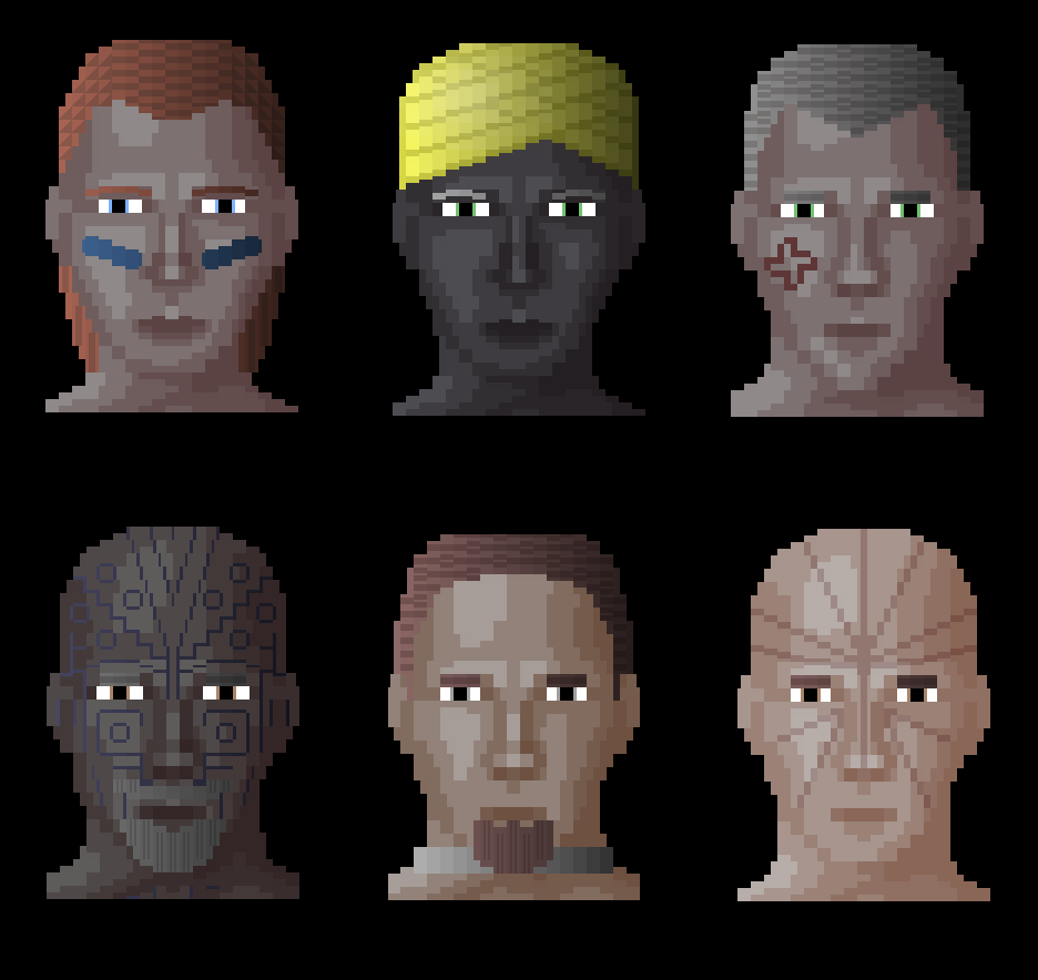 Firstly, what should they look like? I wound up creating an interwoven two part model of biological and cultural NPC elements. On the biological front, we have a range of variations: different genetic groups have different randomly-selected shapes of eyes, chins, necks, ears, noses, and so forth, alongside different colours for their hair, and their eyes. Skin tone of course varies with how close to the equator a particular person’s family originally hail from, with an appropriate range of variation from the darkest black to the palest white. I then combined these with cultural elements, which take two distinct forms: cultural elements that are applied to an NPC’s face (the only part of their “body” you can see in-game), and those applied to the items (clothing, weapons, etc) that a character happens to carry with them. On the faces of NPCs we find a massive range of hairstyles for both women and men which vary with culture, along with sets of distinctive cultural practices: scarification, tattooing, specific kinds of jewellery, turbans, paint markings, and many others.