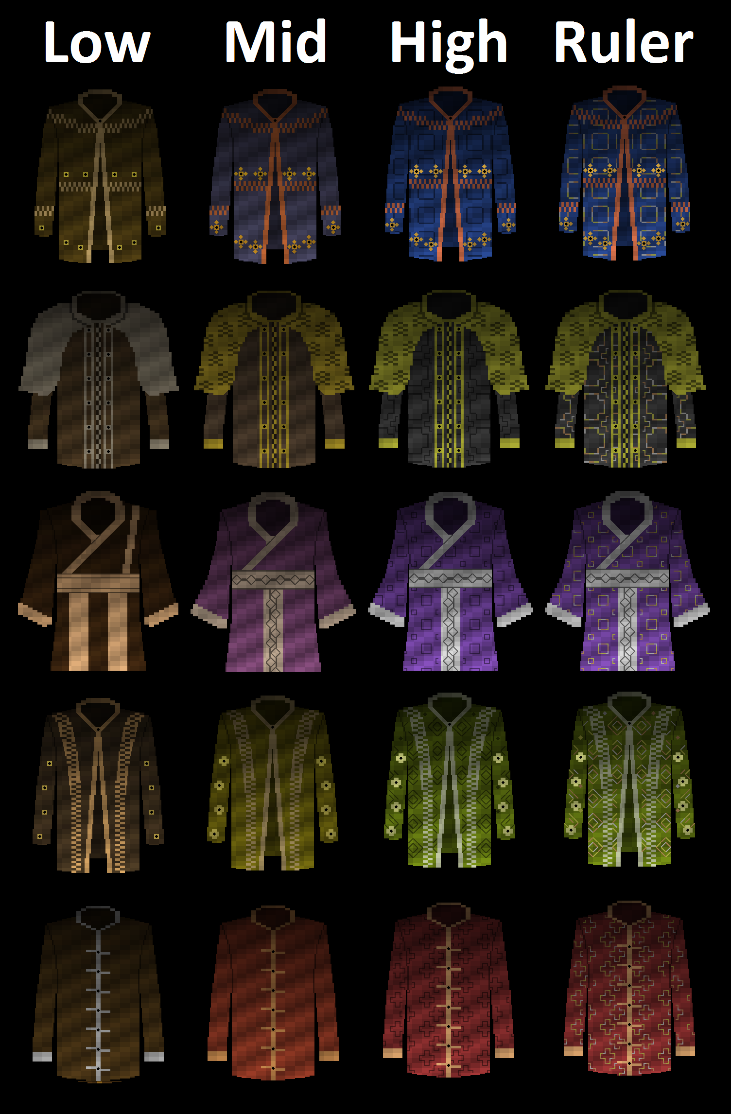 This was then joined by clothing styles, for which I found myself building a rather detailed procedural clothing style generator. Clothing styles can have shirts and trousers, waistcoats and skirts, dresses, or togas, or anything in-between, with additional variation in style and appearance determined by the overall aesthetic preferences of the nation in question for certain shapes, certain colours, and so forth. Styles are distinctive either to entire cultures, or to niche demographics within a culture, such as the religious clergy, or soldiers. Each clothing style then breaks down into multiple tiers, helping the player identify the status of an unknown NPC and adding far greater variation to this part of the game visuals.