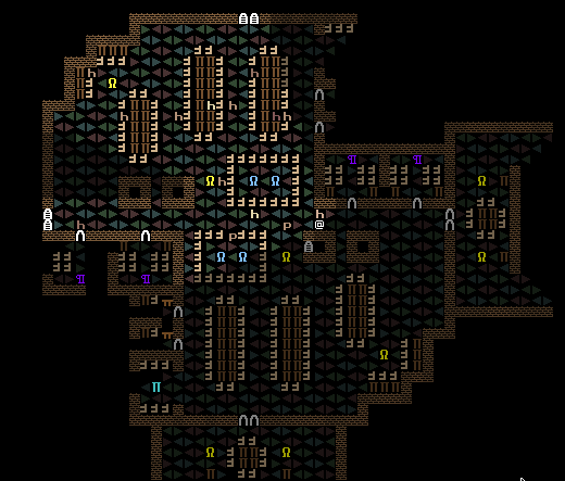 Developing NPC behaviours means how they spend their day, and how they talk to the player. The NPCs in URR now range from mercenaries to priests, guards to merchants, farmers to inquisitors, and arena fighters to servants and eunuchs. Each NPC class spawns and lives in a different part of the map and has a very different set of rules for their average everyday behaviours – take, for example, this screenshot of priests and worshipers (standard humans, shown with an “h”) going about their day.