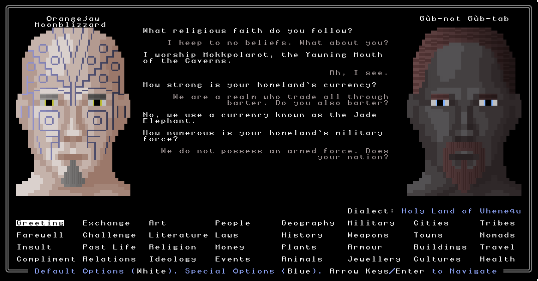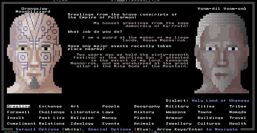 These highly active NPCs are then married with a pretty unusual speech system. Joining us now in this last part of 2016’s URR journey will be Orangejaw Moonblizzard, my profoundly procedurally-generated and facially-tattooed playtesting character who has travelled with me for over a month now – which is to say, I haven’t in this time needed to generate a new world to experiment with, and thereby expunge brave Orangejaw from existence. The goal was to create a speech system where the player could ask a tremendous range of questions without having to resort to programming it as a “chatbot”, to create realistic (or at least realistic-ish) human conversations, and to allow the player to uncover large volumes of information about the game world simply by speaking to its inhabitants. AS things stand now, I feel very confident this objective is almost complete:
