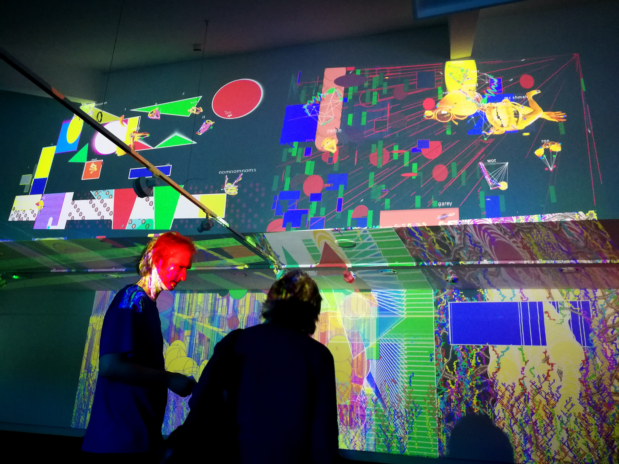 For years we had been making interactive art with computers and sensors and projecting these works into group shows. We started thinking about how these artworks would interact when there was nobody in the space, as there is nothing sadder than interactive art with no audience. We were told to be careful that our projections and sounds did not leak over into another artist's personal space. And then we had enough of that — we decided to reverse this rule and worked with artists who deliberately bleed into and over each other. Artworks were designed to interact with artworks. Then you put the audience in the middle and see what happens. Nobody knows what will happen! Digital Art is particularly good at this — the outputs change in response to the inputs according to collections of behavioural algorithms and sensors positioned by the artists. Combine enough of this together and the resulting chaos can be thrilling to behold — and can develop a life of its own.