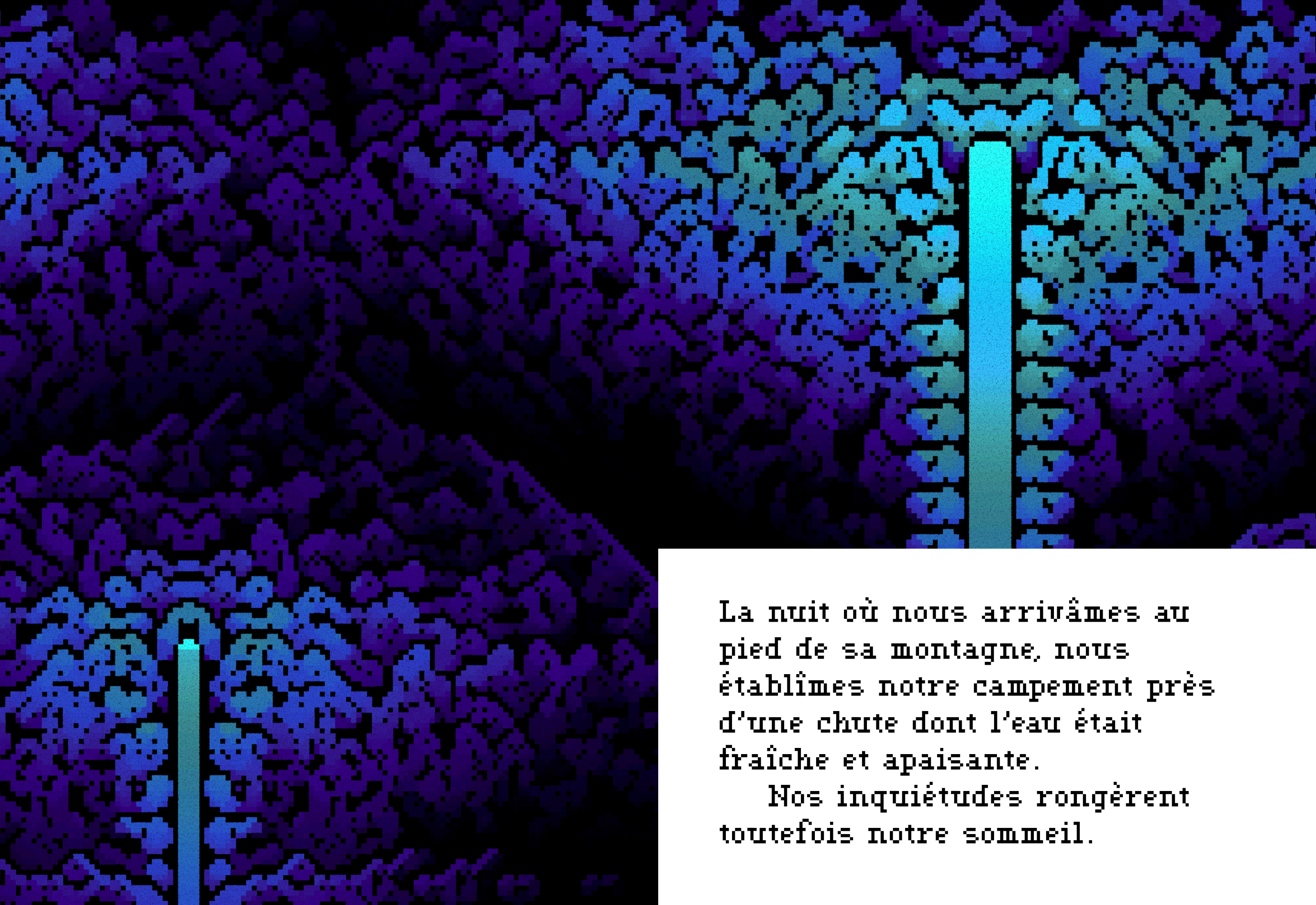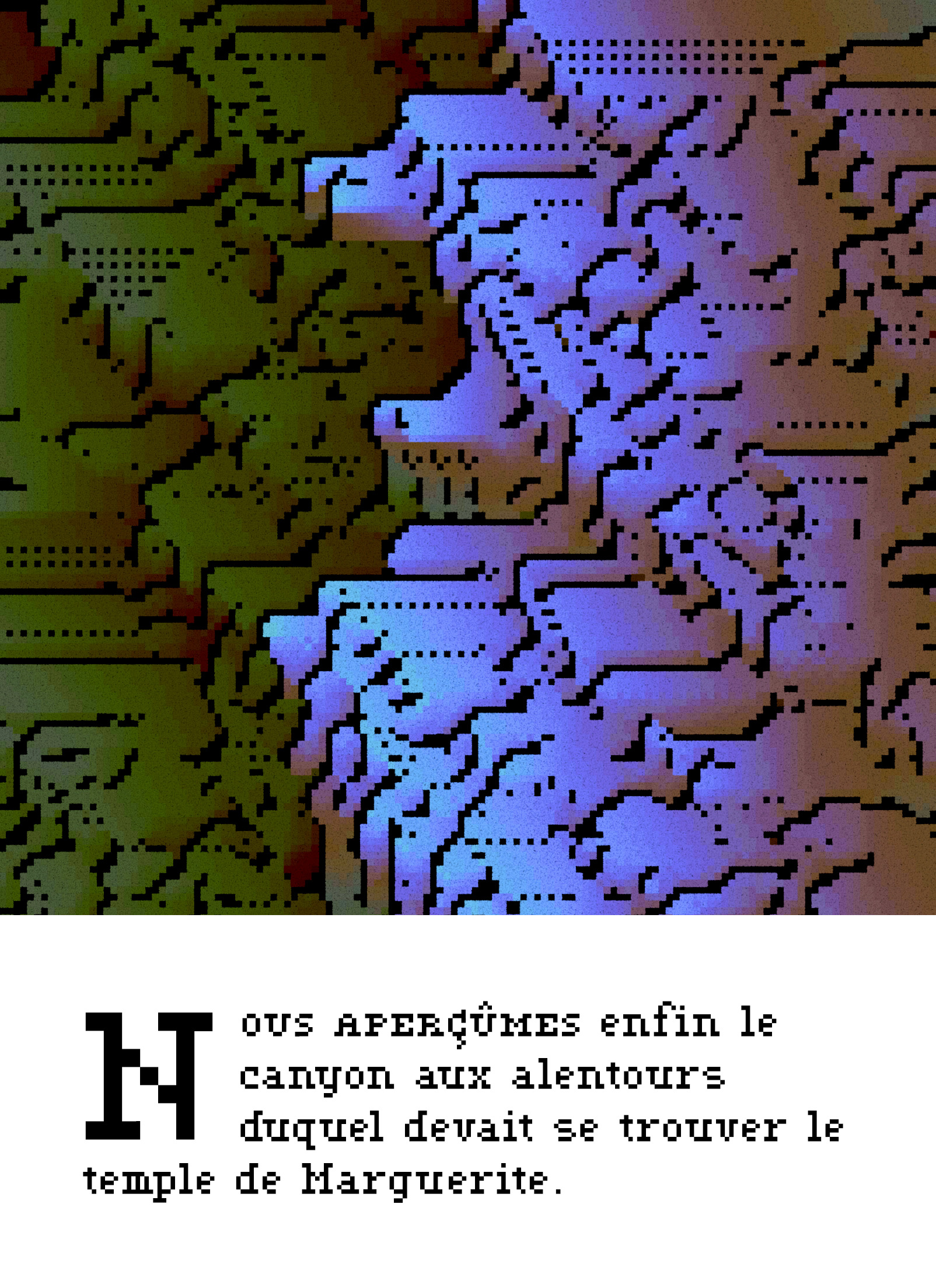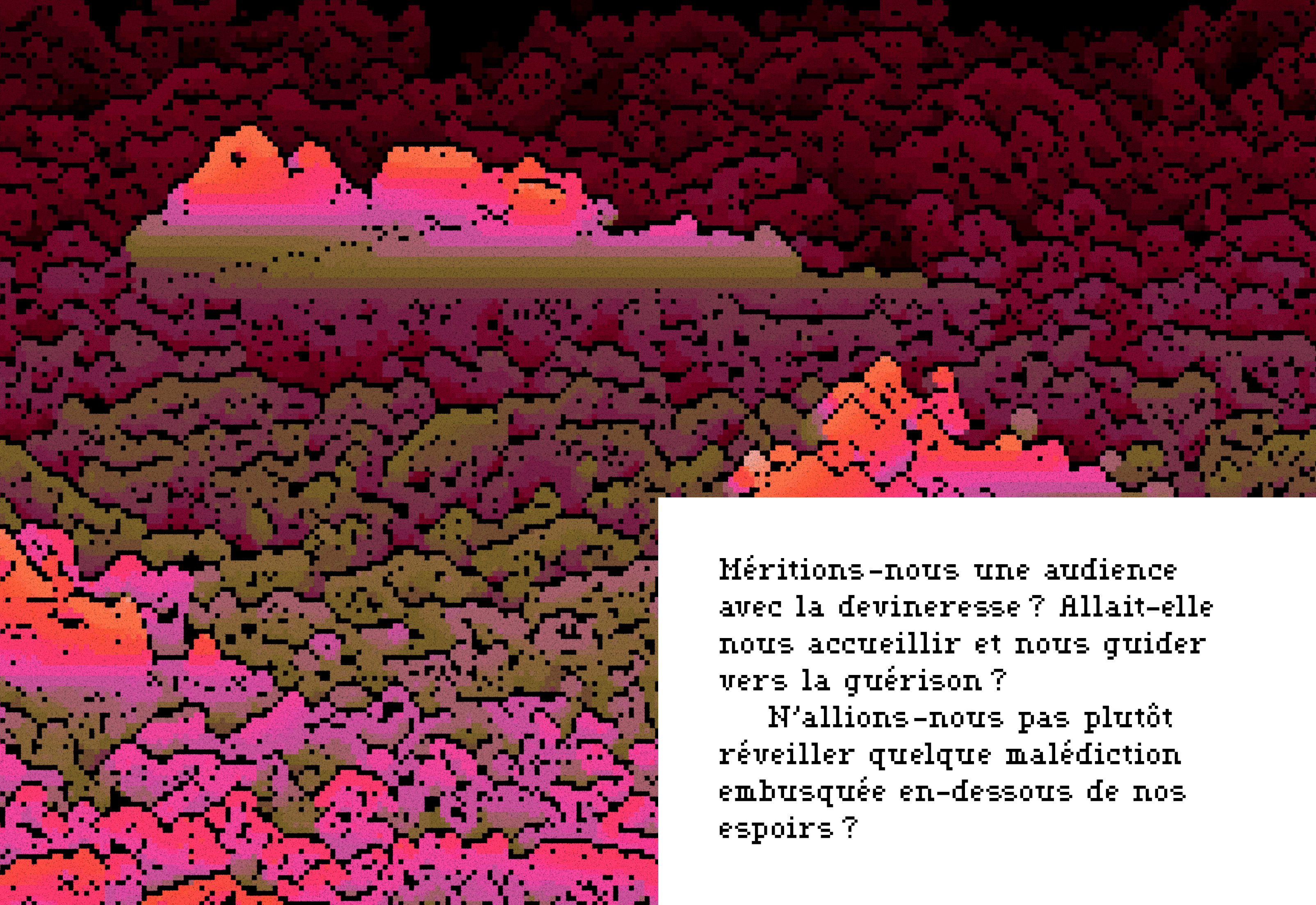 Hi! Here are a few pages of a comic book that I’m currently working on. The images were generated from cellular automata with p5.js, so I thought maybe it could be appropriate for your Seeds zine. The colour palettes were also procedurally generated. The comic is written in French. Basically, it’s a story about anxiety disorder, therapy, and healing. But not much of it is written yet. Those pages have already appeared in a self-published zine collecting the works of a few comic books artists from Montréal (it was a small thing between friends, only 50 copies were printed).