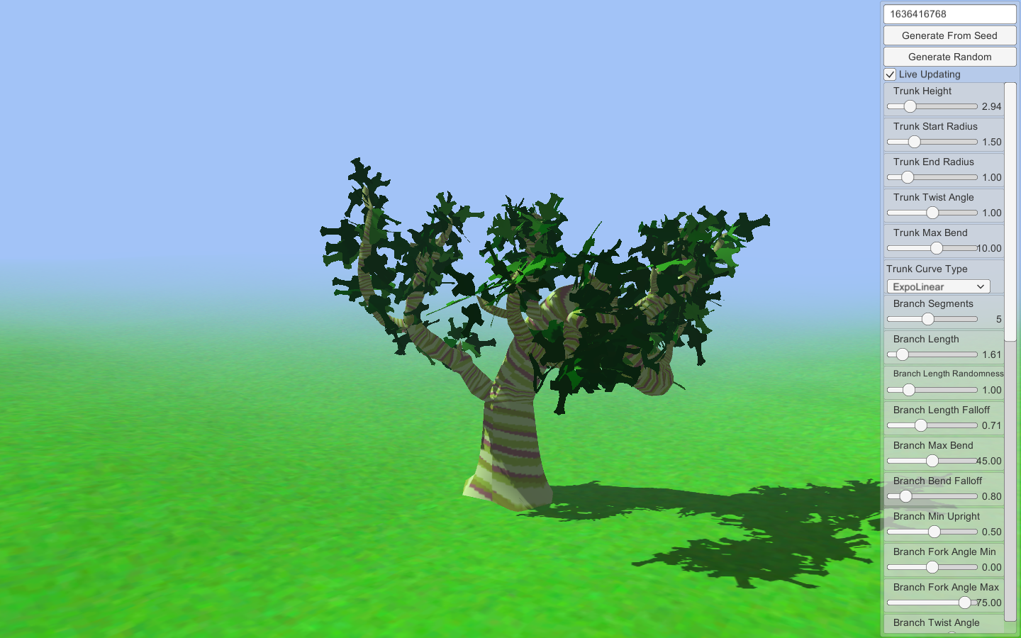 From here I hope to keep building upon my toolkit, gradually producing more complex and interesting shapes and also making the meshes produced efficient and scalable so I can generate whole forests. This was really just an introduction into the methods I’ve used, as a lot of technical challenges have presented themselves along the way. Generating different levels of detail was a big one. At one point I threw out everything and started again just so I could have control over this aspect right from the start! But now I have a friendly ‘polygon density’ slider that does all this for me.