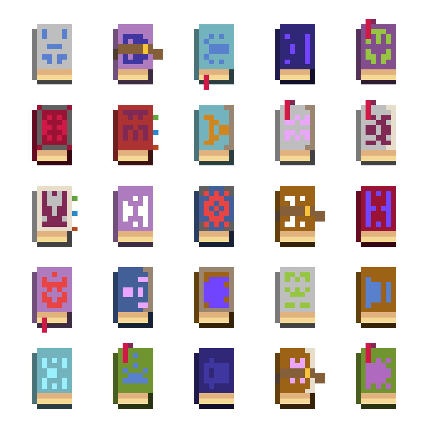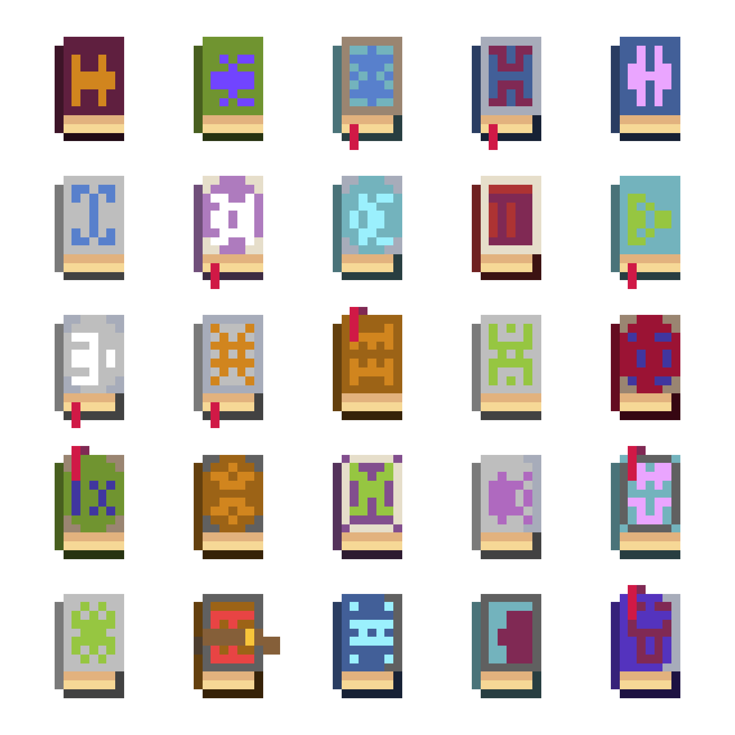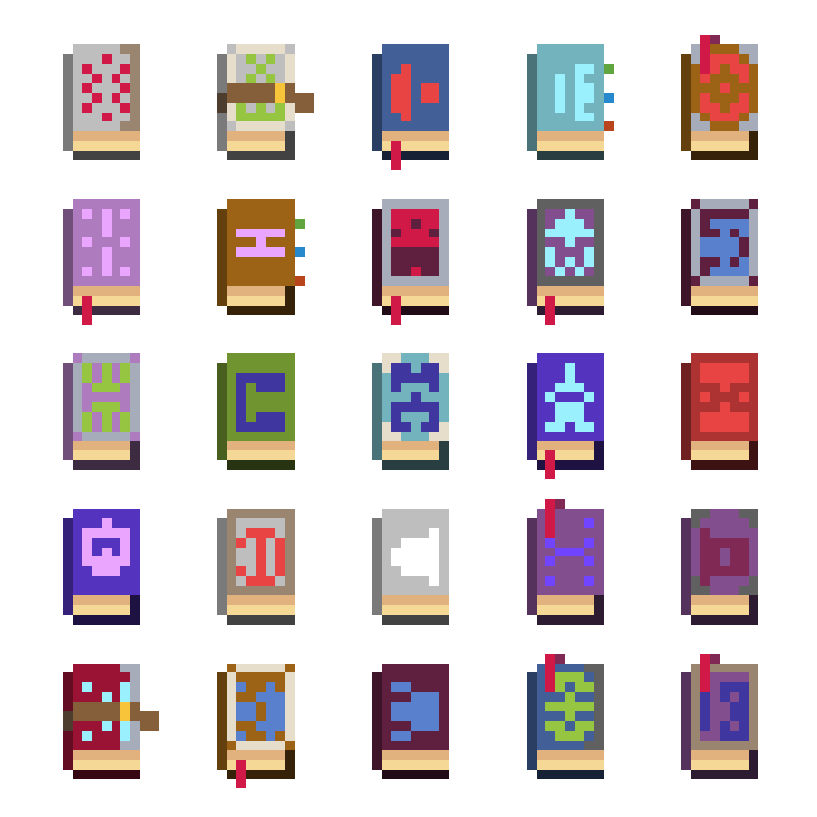 These sprites were generated to be used as spellbooks in a roguelike game (Lore of Rune Era). The process for their generation is pretty straightforward — a series of image layers, each of which can have one or more possible sprite, are colored and drawn on top of each other. This allows for variation in the shape and details of the sprite — some of the books have different bookmarks or clasps, for example, and vary in color.