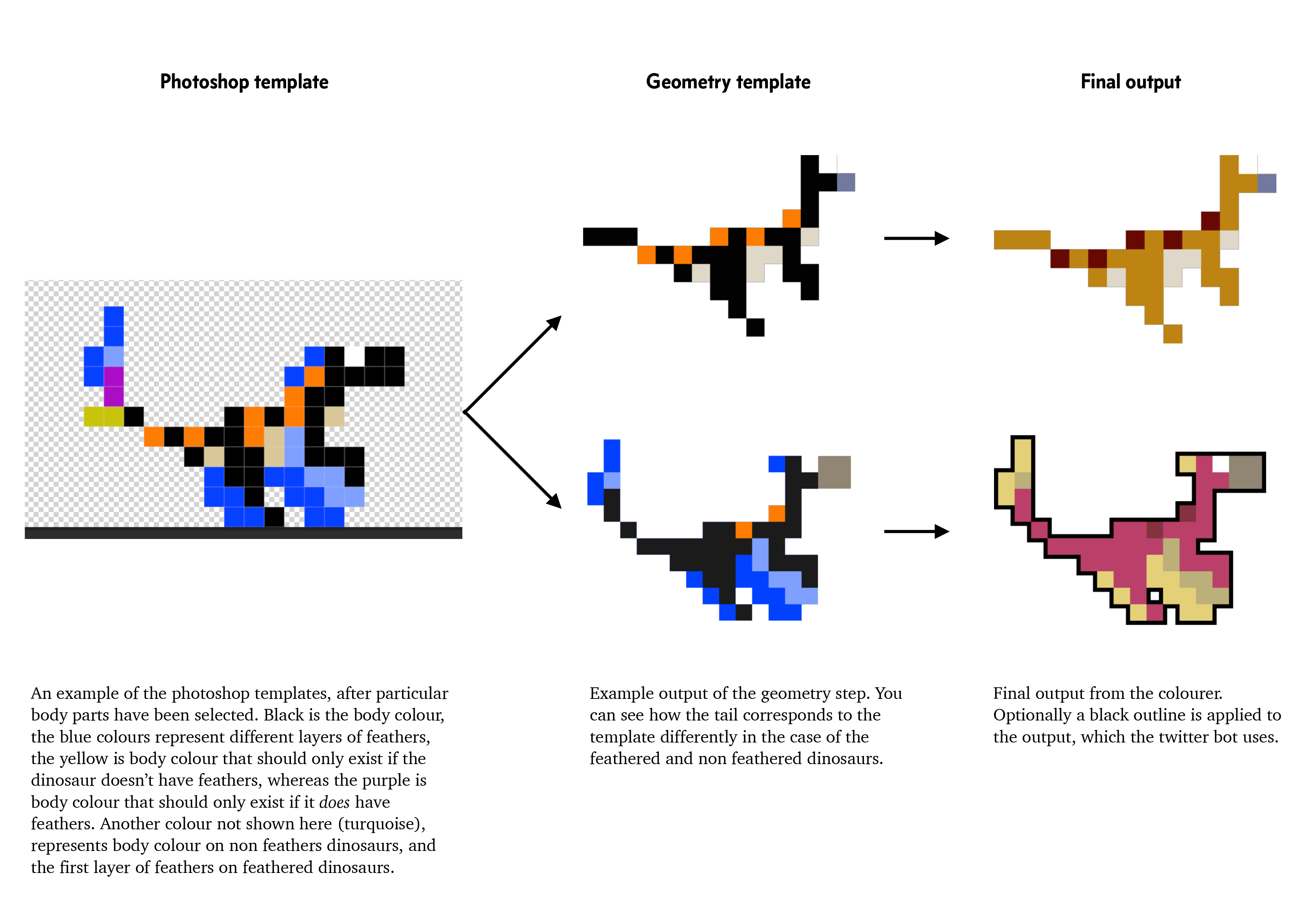 Each one uses the same basic approach, with generation split into two phases: the first step produces a colour-coded geometry template, and the second colours it. For the geometry step, each sub generator has a photoshop file, with layers sorted into groups for each part of the anatomy (e.g. a group of tail options), which the generator then may pick zero or one of the layers in that group (e.g. a tail is compulsory, a horn isn’t). Some groups are also given a range of possible spatial offsets (e.g. some horns can be lower down and a position will be randomly selected). This structure is also leveraged to do different kinds of modifications, such as instead of selecting one from a number of body options, there may be a number of layers that can be added to modify the appearance of a the base body. There are also some conditional rules, such as if the top ceratops horn is too low or too big, it's not allowed to have a lower one. The photoshop files are colour coded, with separate colours for main bodies, horns, spines, eyes, feathers, and a number of colours specific only to the theropod generators, so that feathers can be removed, lengthened, and coloured with different patterns, allowing the generator to use the same files for both more retro scaley theropods, and theropods that are practically birds, like archaeopteryx.